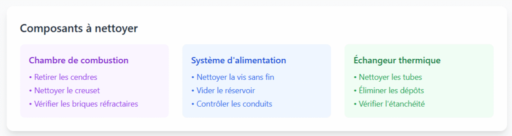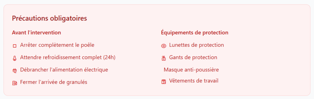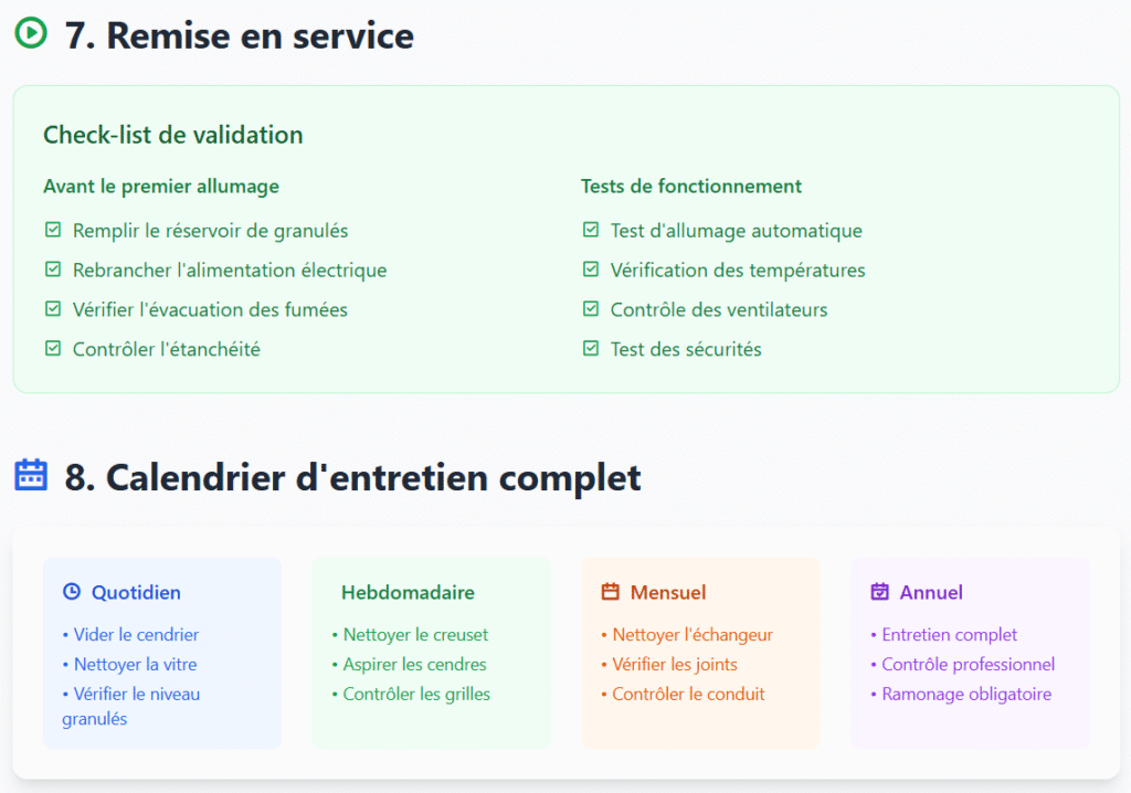 L’entretien annuel de votre poêle à granulés est crucial pour maintenir ses performances optimales, assurer votre sécurité et prolonger sa durée de vie. Un poêle bien entretenu consomme moins, chauffe mieux et présente moins de risques de panne.