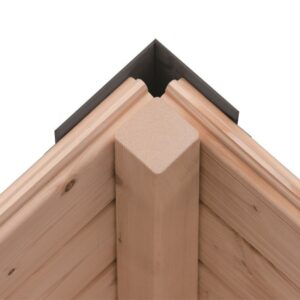 L’abri de jardin Jupiter est réalisé en épicéa nordique de 19mm. Les madriers s’emboîtent parfaitement pour un montage solide. Dans le cas du bois brut, vous devez lasurer les madriers avant le montage. Lorsque vous choisissez l’abri peint, il est déjà protégé contre les intempéries grâce à sa peinture de qualité, totalement écologique. La finition des coins et du cadre de la porte est en acier pour une longévité accrue. Le toit est couvert d’un tôle trapézoïdale de 0,5mm et possède de larges débords en acier pour une protection optimale contre les intempéries. Les détails en acier ne demandent aucun entretien ce qui est pour vous un gain de temps important.