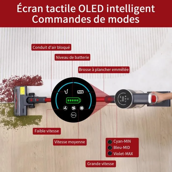 ✔ Écran tactile LED intelligent : Indique le mode et le niveau de batterie pour un contrôle total.