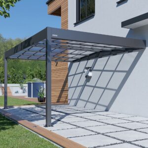 Un carport en aluminium est une alternative économique et esthétique à un garage en dur et il est beaucoup plus rapidement mis en œuvre. Il protégera votre véhicule des aléas climatiques et limitera son exposition au rayonnement UV de jour comme de nuit (plaques de polycarbonate teintées). Fini la peinture qui se dégrade, les grêlons qui ravagent la carrosserie, le dégivrage en hiver… Ce carport adossé vous apportera un confort appréciable en toute saison ! Sa surface couverte de presque 16 m² et ses larges dimensions vous permettent d’abriter tout type de véhicule : décapotable, hors-bord, moto, monospace, remorque…