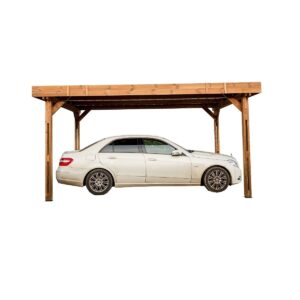 Ce carport en sapin traité à très haute température (sans aucun ajout de produit de synthèse) se fondra dans votre jardin avec élégance. Une voiture de taille standard (surface au sol de 17,54 m²) sera protégée toute l’année sous son toit monopente en couverture acier galvanisé. Ces 4 poteaux en 12×12 assure stabilité et longévité de votre carport en bois.