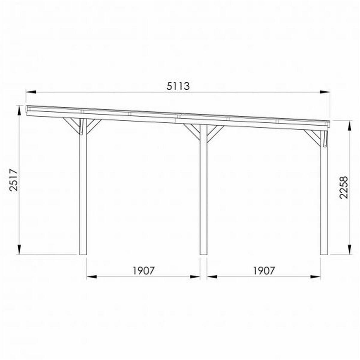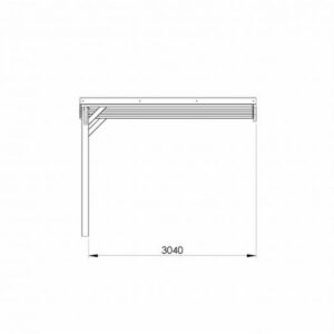 Couverture en polycarbonate opaque gris. 3 poteaux de sections en 12 x 12 cm. Largueur de passage utile : 3,04m. Largueur entre les poteaux latéraux : 1,91m. Quincaillerie fournie avec vis de charpente. Supports de poteaux à sceller en option. Hauteurs intérieures : 2,34 à 2,14m. Surface utile : 15,5m² – Surface hors tout : 16,1m². Dimensions hors-tout : L.320 x P.512 x H.252