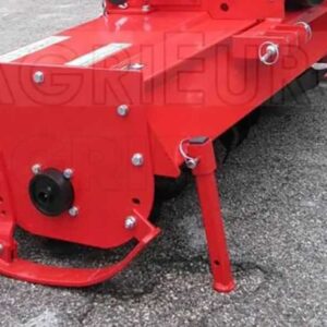 Pour déplacer l’ensemble de l’attelage à trois points de cette fraise rotative à tracteur, il suffit de desserrer les manivelles.