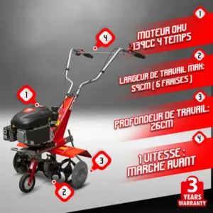 Grâce à cette motobineuse, vous n’aurez plus peur d’abîmer vos fleurs lorsque vous travaillez. En effet, elle est équipée de caches en métal afin d’assurer la protection de vos plantes. Pour un confort d’utilisation maximal, elle est équipée d’un large guidon.