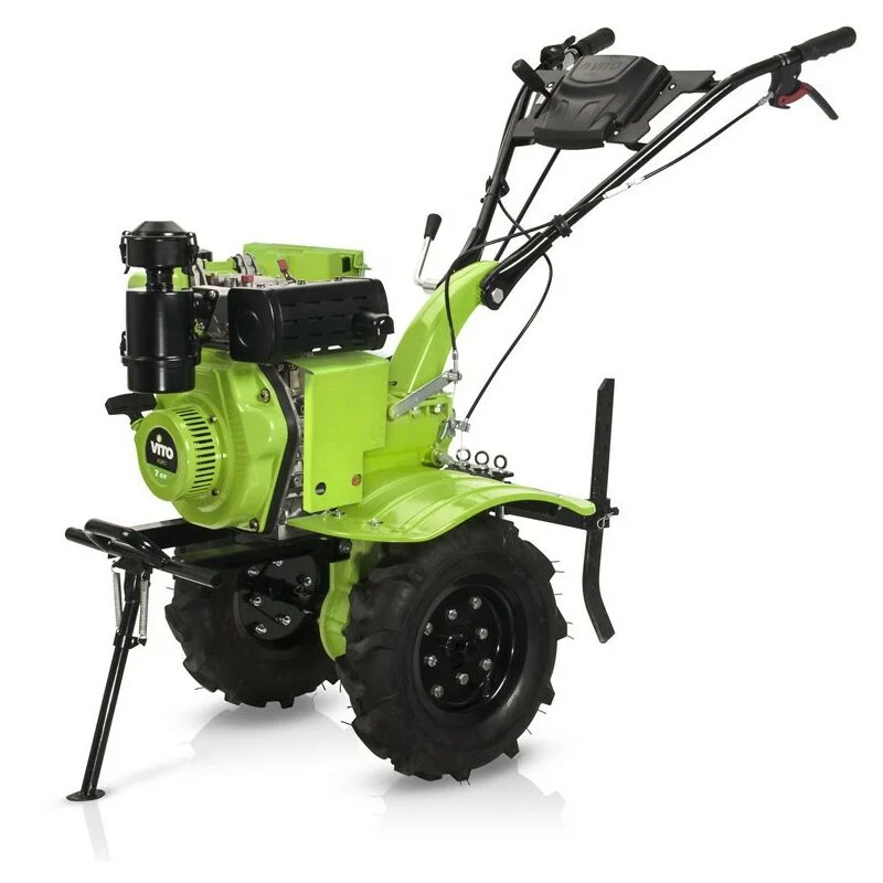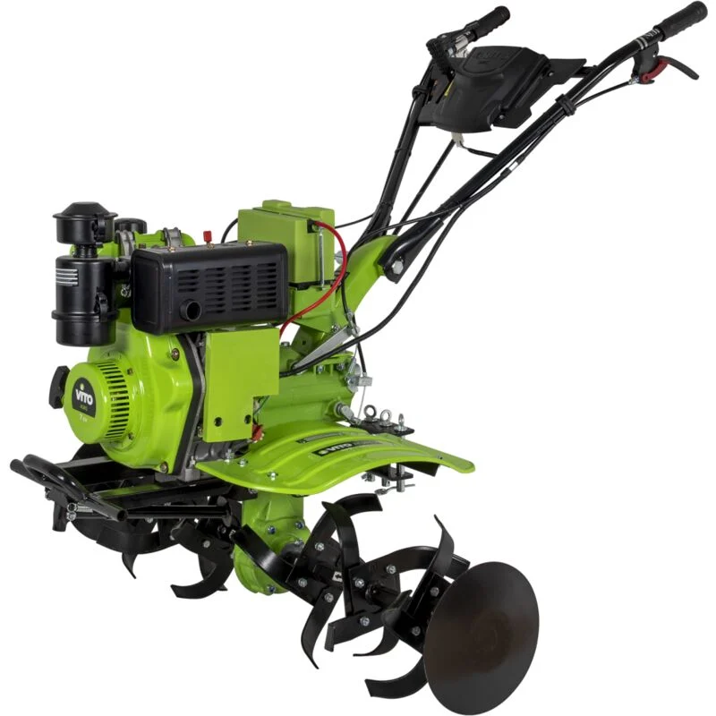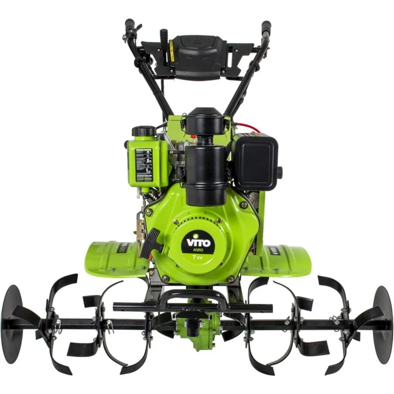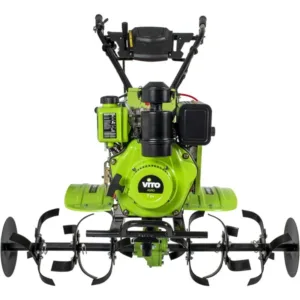 Motoculteur thermique polyvalent diesel 246 cm3 VITO AGRO 7CV avec transmission directe 5200W. Livré avec fraises et butteur pour labourer le sol, le décompacter et l’aérer. Cette machine est parfaite pour travailler le sol pour l’agriculture et le maraîchage. Elle permet de faire la mise en culture des sols et l’entretien du jardin potager ou maraîcher. Contient : Fraises et butteur