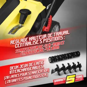 • Réglage de la hauteur de travail : Ajustable sur 5 positions (scarificateur de -13 à -1 mm et émousseur de -9 à 3 mm), pour s’adapter aux différents besoins de votre pelouse.