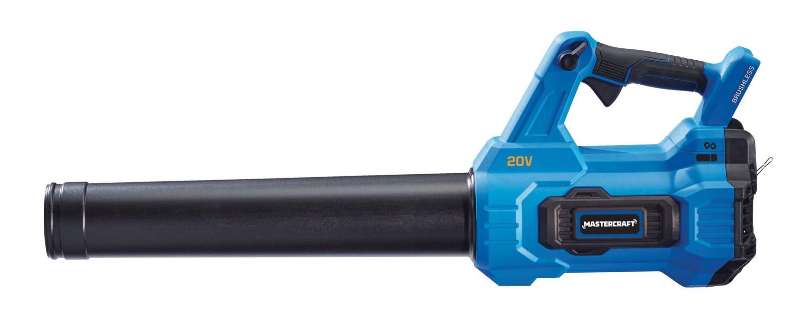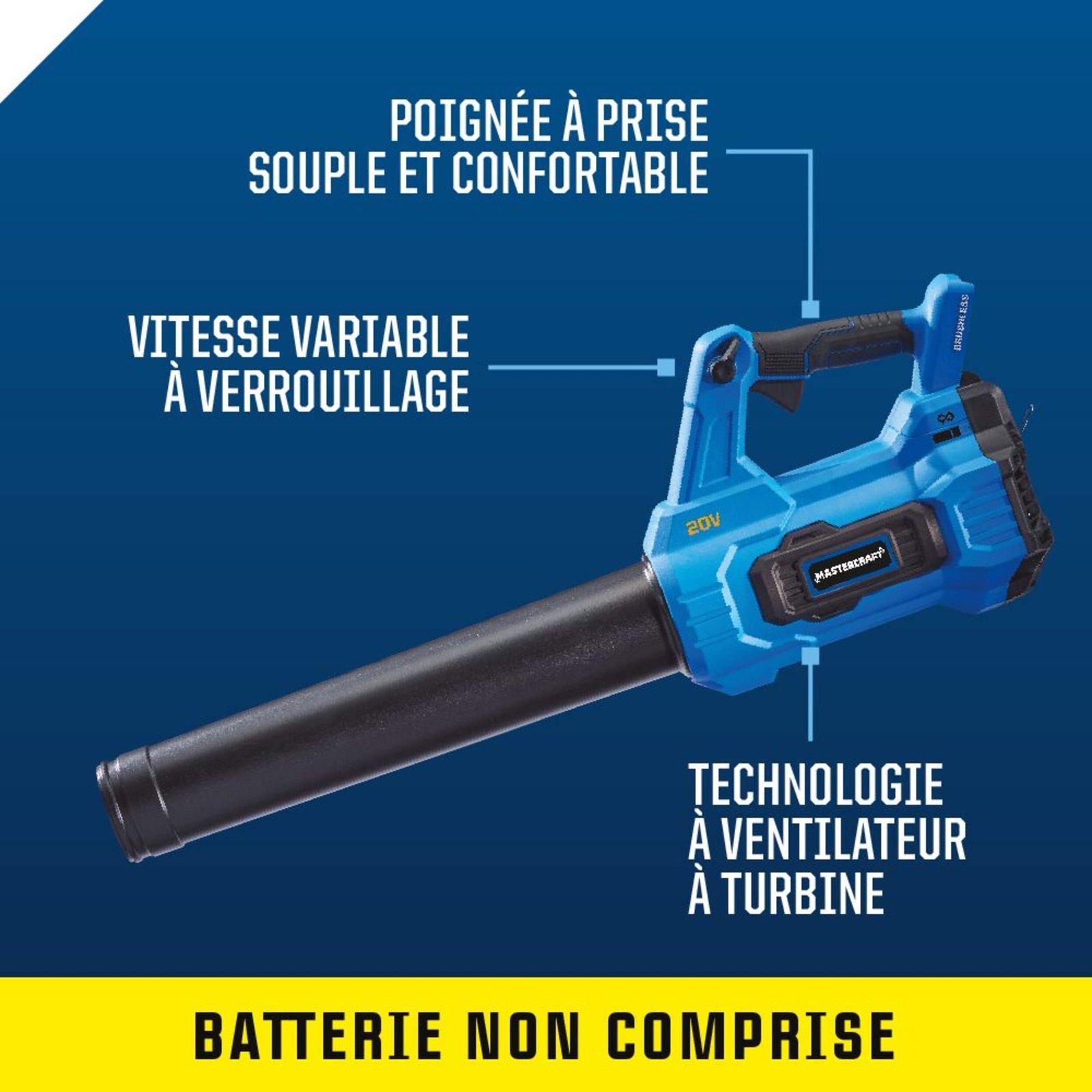 • Souffleuse à feuilles sans balais Mastercraft 20 V Max alimentée par une batterie de 20 V et un moteur sans balais pour une performance plus fluide et silencieuse