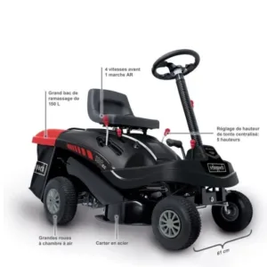 La Scheppach MR196 61 est une tondeuse autoportée puissante et compacte, idéale pour entretenir des surfaces jusqu’à 2 600 m². Son moteur thermique de 196 cc à démarrage électrique, développant 6,5 cv, assure une coupe nette et efficace, même sur terrains accidentés. La transmission mécanique offre 4 vitesses avant et 1 marche arrière, garantissant une maniabilité optimale pour un travail précis et confortable.
